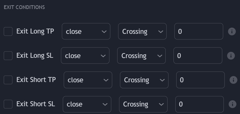 Long/Short stop losses exits conditions will exit a long or short order when a set condition is met such that the position exit on a loss. Stop losses conditions are triggered if they are toggled on for a specific order (Long/Short) and if the selected external source is either Crossing, Crossing Up, or Crossing Down, Greater Than, Lower Than, or Equal to the numerical value specified by the user.Time Exits