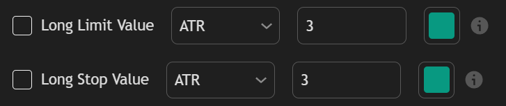 | ATR | Set the limit/stop orders N average true ranges away from where the entry condition is met, where N is a specified multiplier. |
