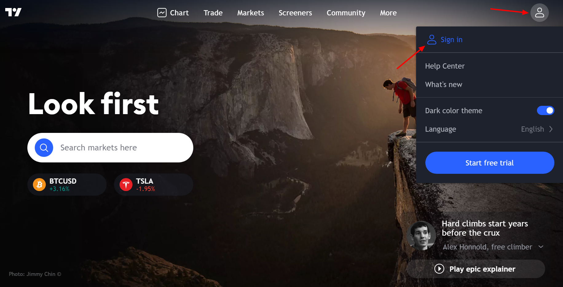 In order to create a TradingView account, you need to go to the TradingView homepage. Click on “Sign in” at the top right of the homepage, then click on “Sign up” at the bottom of the current window. You can sign up using your social media profiles or an email address.