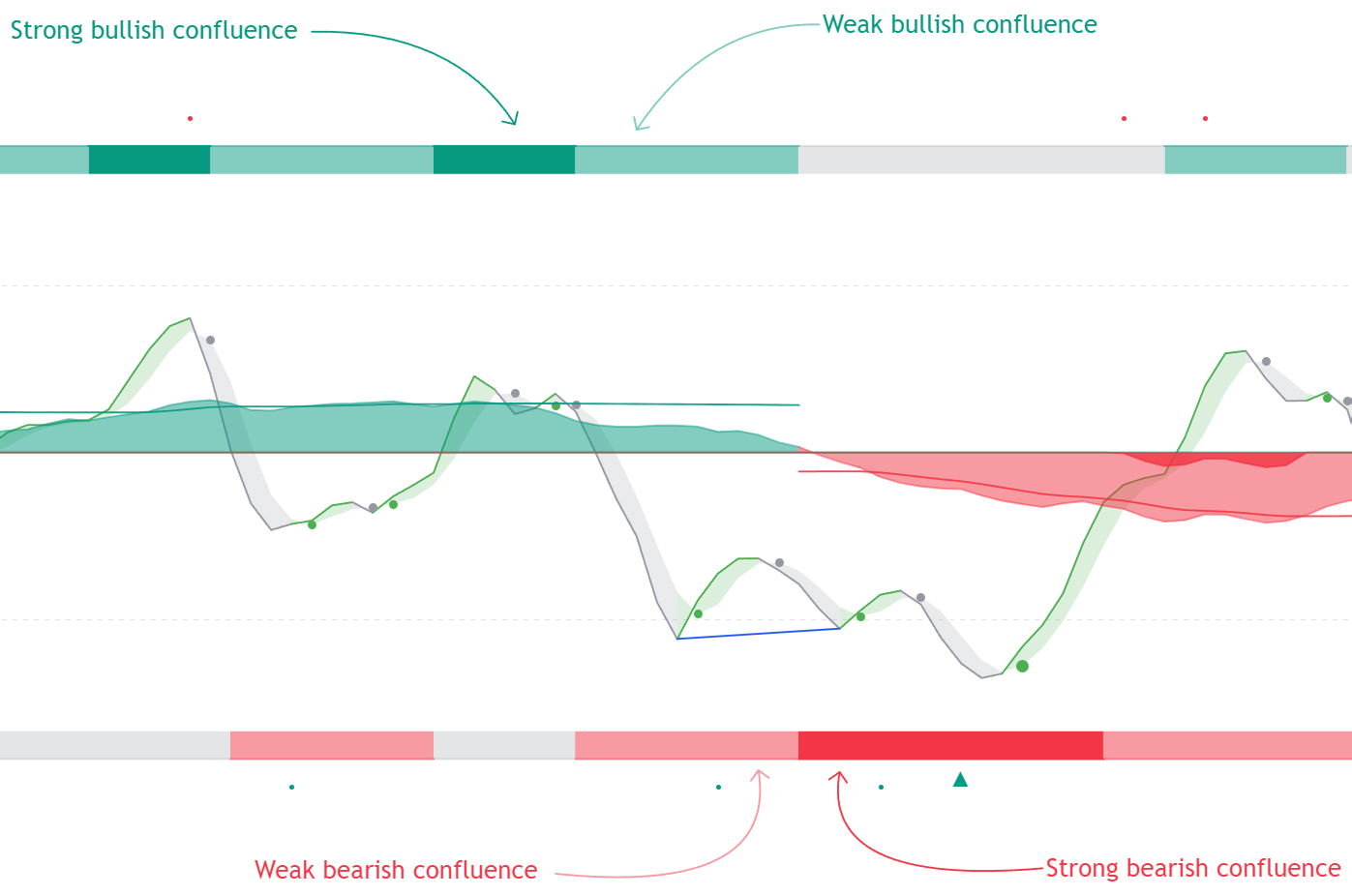 When both the Hyper Wave and Money Flow oscillators are indicating an uptrend the upper zone is colored with a darker green. If only one of the oscillators is indicating an uptrend then the confluence zone will have a brighter green. This logic applies to the lower zone in the case of a downtrend.