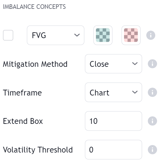 | Close | Mitigates an imbalance once price close cross above the imbalance upper extremity in the case of a bearish imbalance, and under its lower extremity in case of a bullish imbalance. |