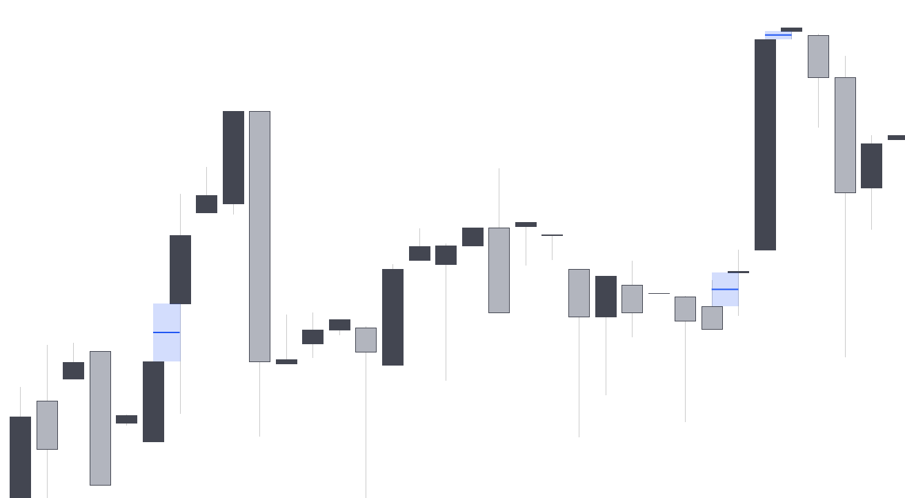 Opening Gaps are market imbalances characterised by two adjacent candles with non overlapping candle wicks, highlighting an empty area. These imbalances are more commonly found in stocks or second timeframes of cryptocurrencies and forex pairs.