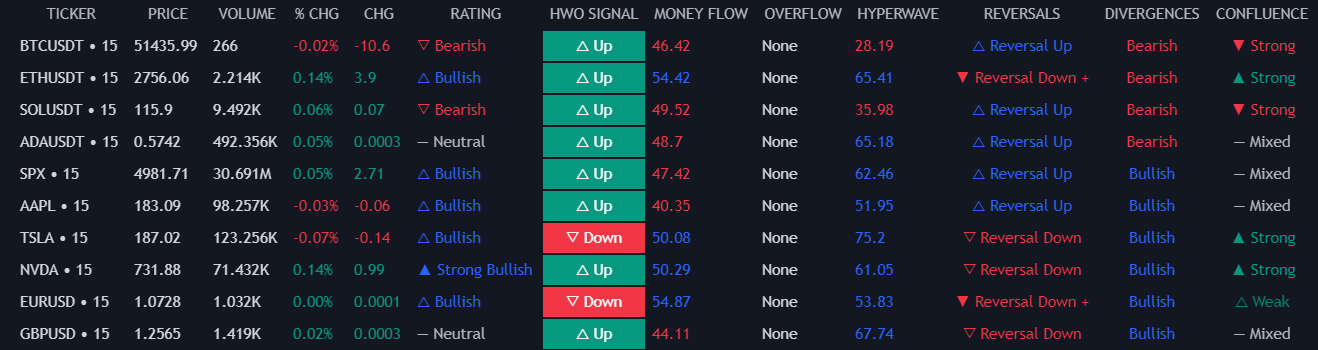 Users can change tickers as well as their respective timeframes from the screener settings. Default tickers include:- BTCUSDT